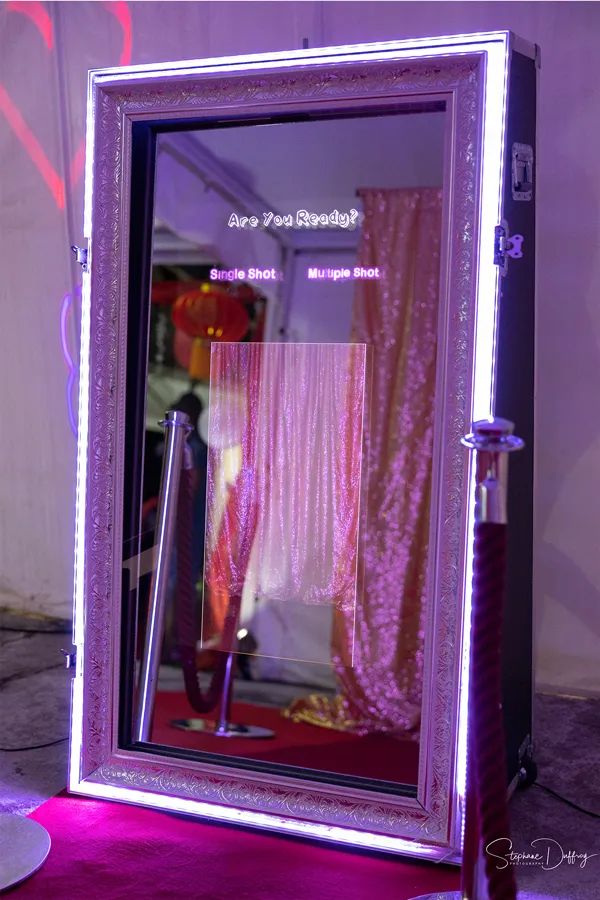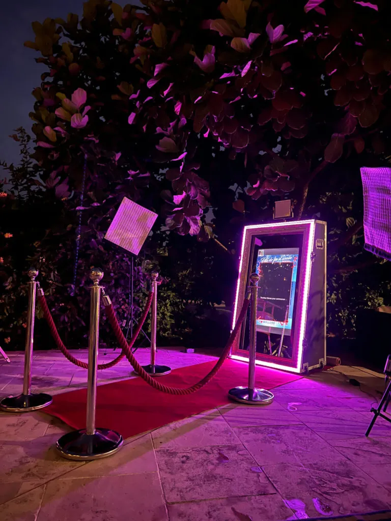 La waltabox magic mirror est accompagnée d’un tapis rouge, d’un rideau pailleté aux choix et de poteaux chromés